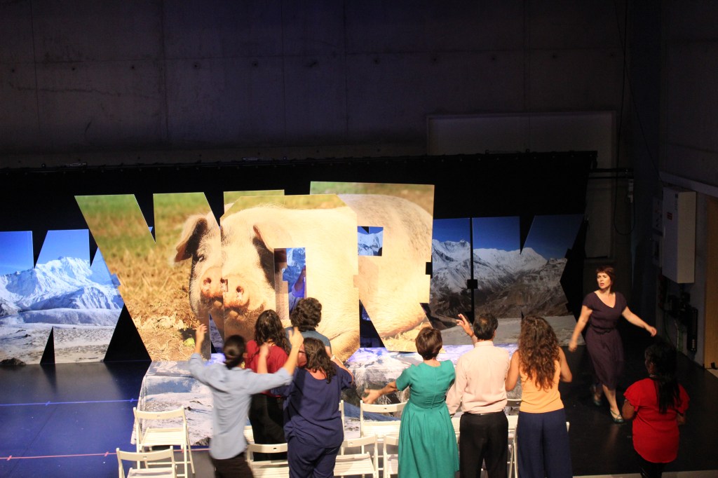 Non professional actors were encouraged to collectively think upon the links between work, leisure and happiness, questioning the status quo and imagining the shape of work in a technological future.